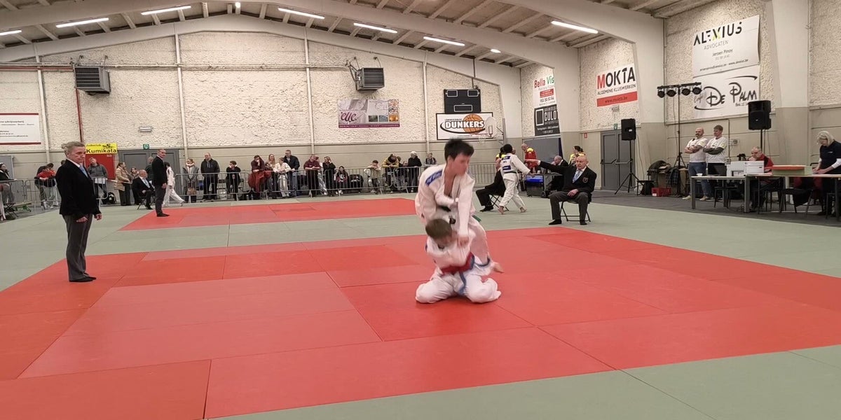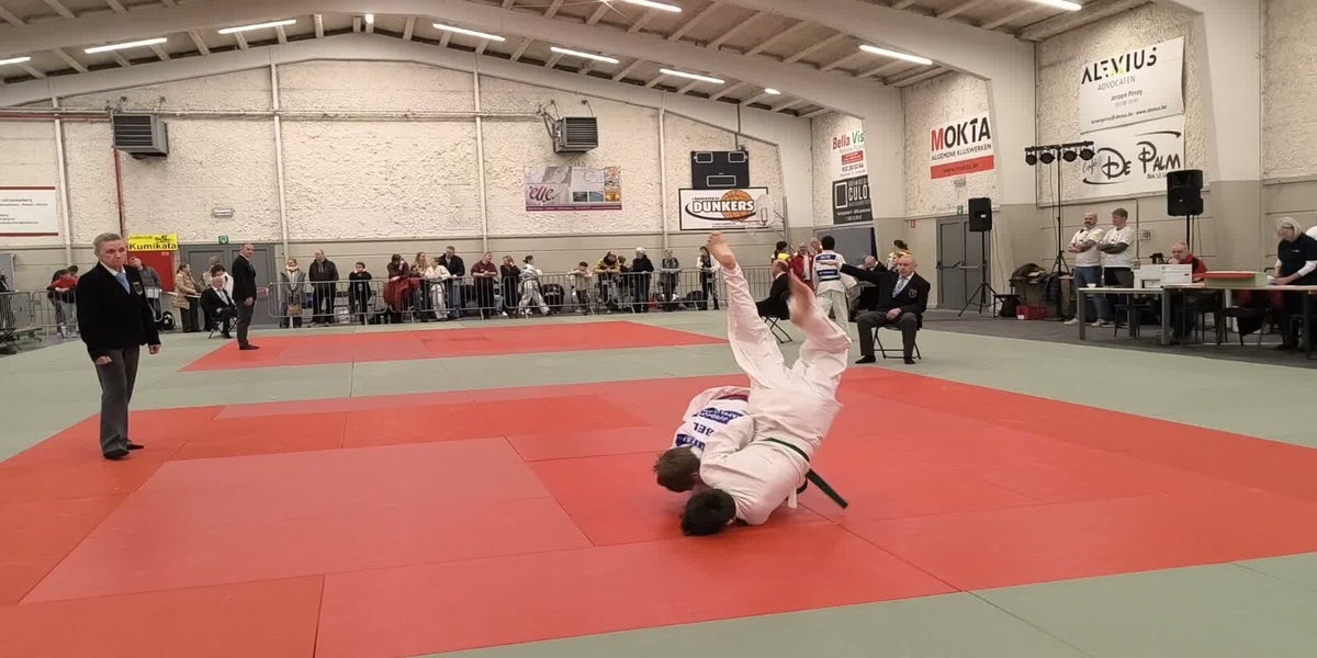 Zijn tweede wedstrijd duurde niet lang. Groeten, geworpen worden (wat goed was voor een waza-ari) en dan nog eens 10 seconden in een houdgreep liggen.